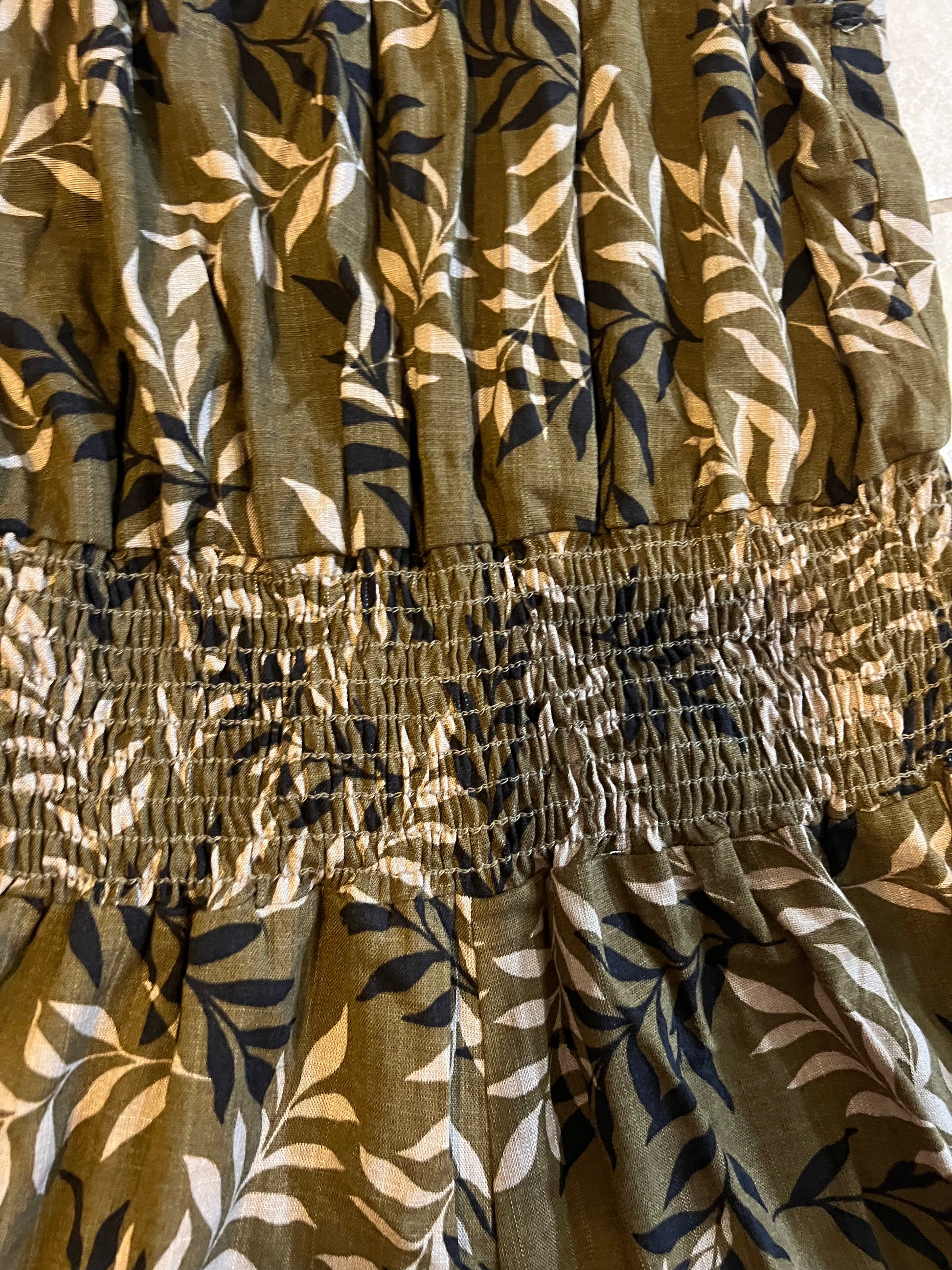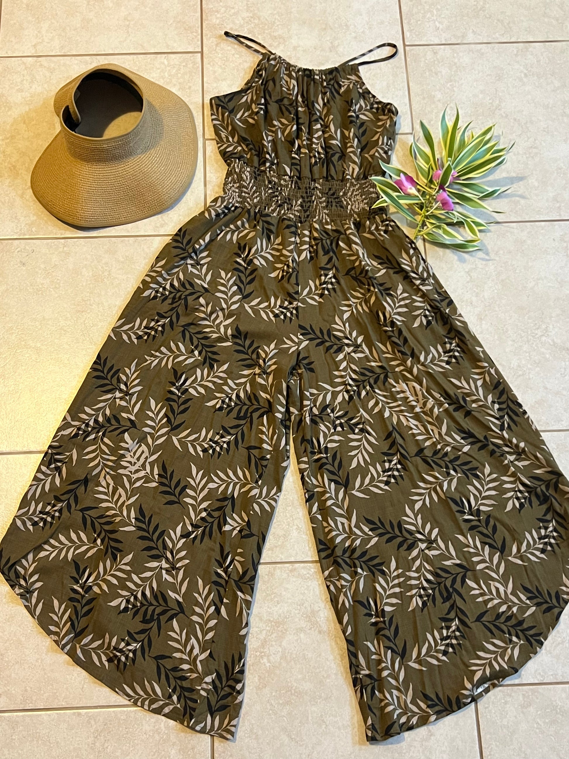 This stylish Halter Jumpsuit features a fern leaf pattern print, adjustable back closure, smocked waist, and pockets - perfect for dressing up or down. Made with lightweight and comfortable fabric, it's a must-have for any closet.