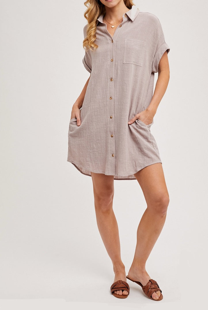 Experience a comfortable and fashionable appearance in this mini dress. This textured cotton cutie features a v-neckline with a collar, short sleeves with cuffs, and button-up front. Plus, side seam pockets and front breast pockets for a practical touch.