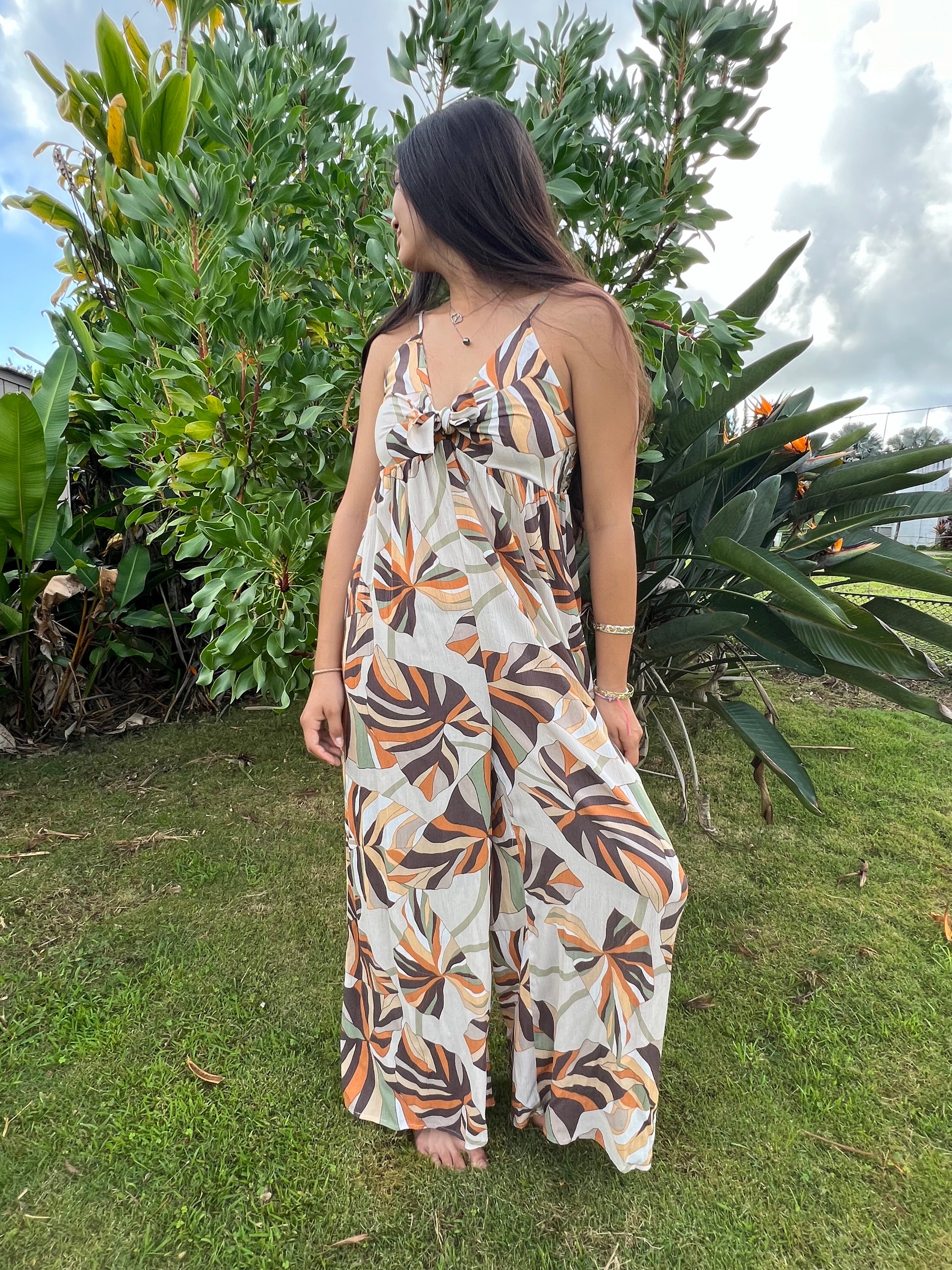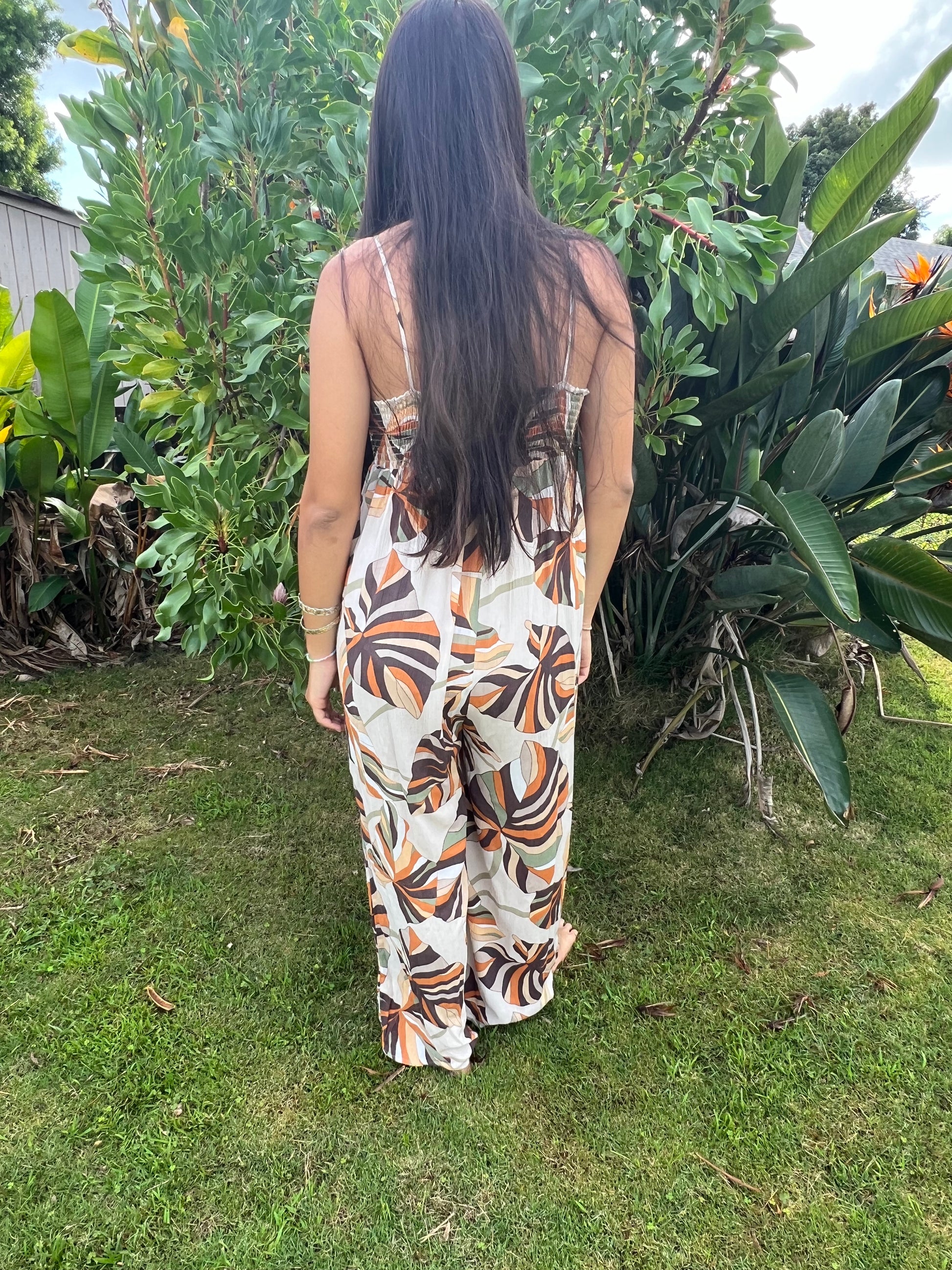 Tropical Cami jumpsuit with spaghetti straps, pockets, smocked back for a fitted look and a cute tie front design. This pattern is gorgeously colored and will definitely turn heads.