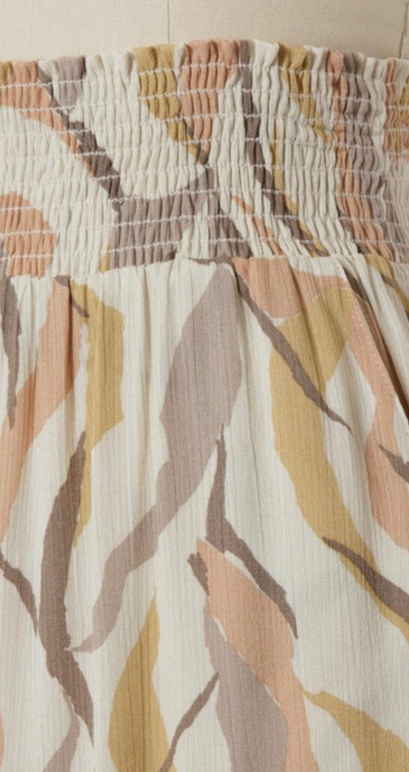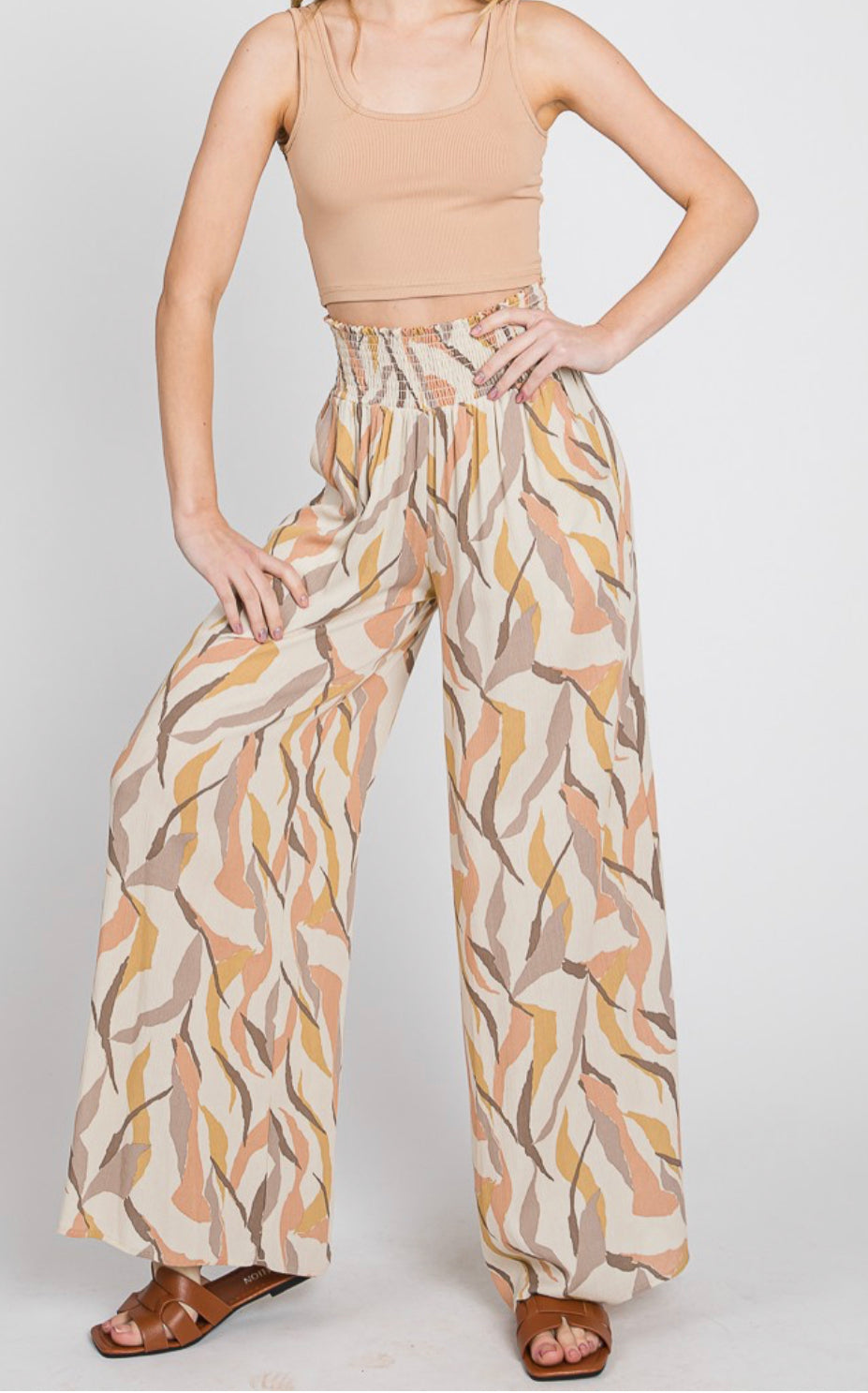 Wide leg mid-waist tropical print pant with pockets, and a smocked waist for a comfortable, flattering fit.