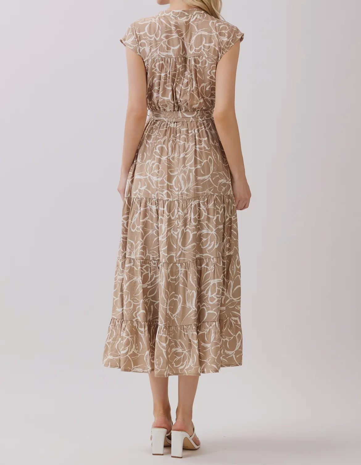 The MALA Button Dress combines effortless elegance with thoughtful design. This tiered maxi dress features a refined print and practical pockets, while a cinched waist tie creates a flattering silhouette. Cap sleeves offer gentle coverage, and the flowing, relaxed cut ensures all-day comfort without compromising style. Perfect for those seeking understated sophistication with functional details.